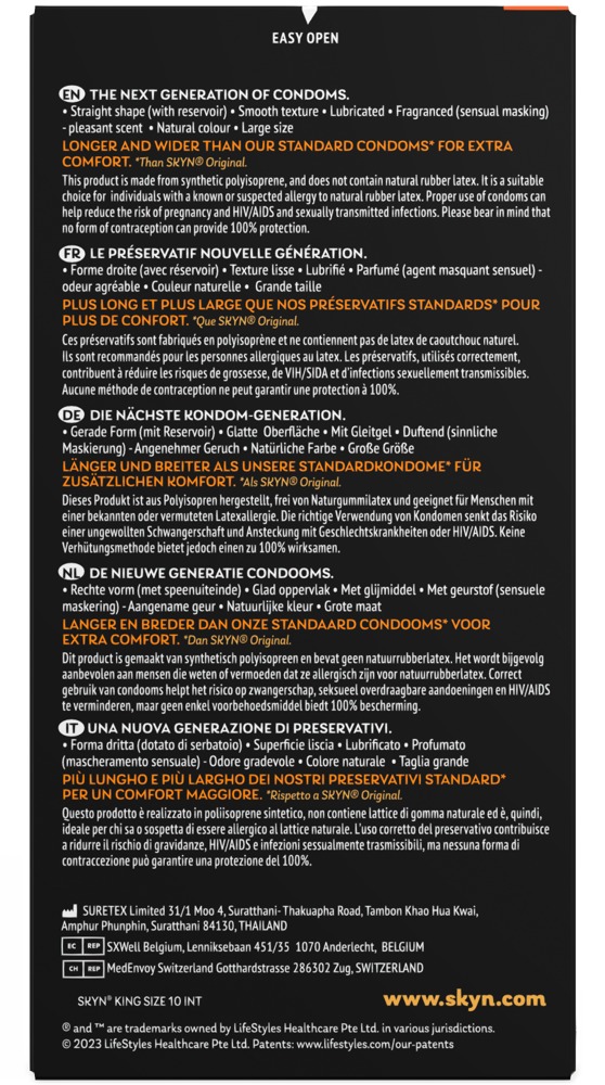 The transparent, lubricated, ultra-thin Manix SKYN King Size condoms are extra large with a length of 190 mm (usual is 180 mm) and a nominal width of 56 mm (usual is 52 mm). The polyisoprene material of the condoms is called Skynfeel and is softer and more elastic than latex, but just as strong and without the conventional latex smell. It is therefore ideal for people who are allergic to latex. Vegan.