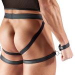 This black set from Svenjoyment BONDAGE contains a sleeveless net shirt with thigh harnesses, a net jock and 2 handcuffs. The soft and stretchy net material has matte look strap appliqué and details. There are also lots of (restraint) rings and decorative studs. The thigh harnesses are securely sewn on to the front of the shirt and can be adjusted to fit with the press studs. There are rings at the sides and they can be used for attaching the included handcuffs and their snap hook chains. The soft restraints can be put on quickly and adjusted with the press studs. The set also has an open back jock with a comfortable waistband and a matte look strap over the pouch with decorative press studs.