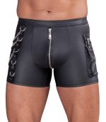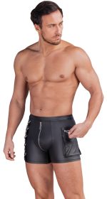 The tight-fitting pants from NEK are made out of cool matte look material. They also have silver-coloured details as well. They are soft, stretchy and have a fabric-covered waistband for maximum comfort. There is a padded zip over the pouch. One side has rings & 3 removable snap hook chains. The other side has a cargo pocket with a zip.