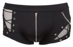 Pants made out of a trendy combination of opaque and transparent (fishnet) material. With a removable decorative chain and zip at the front. Black. Very stretchy.