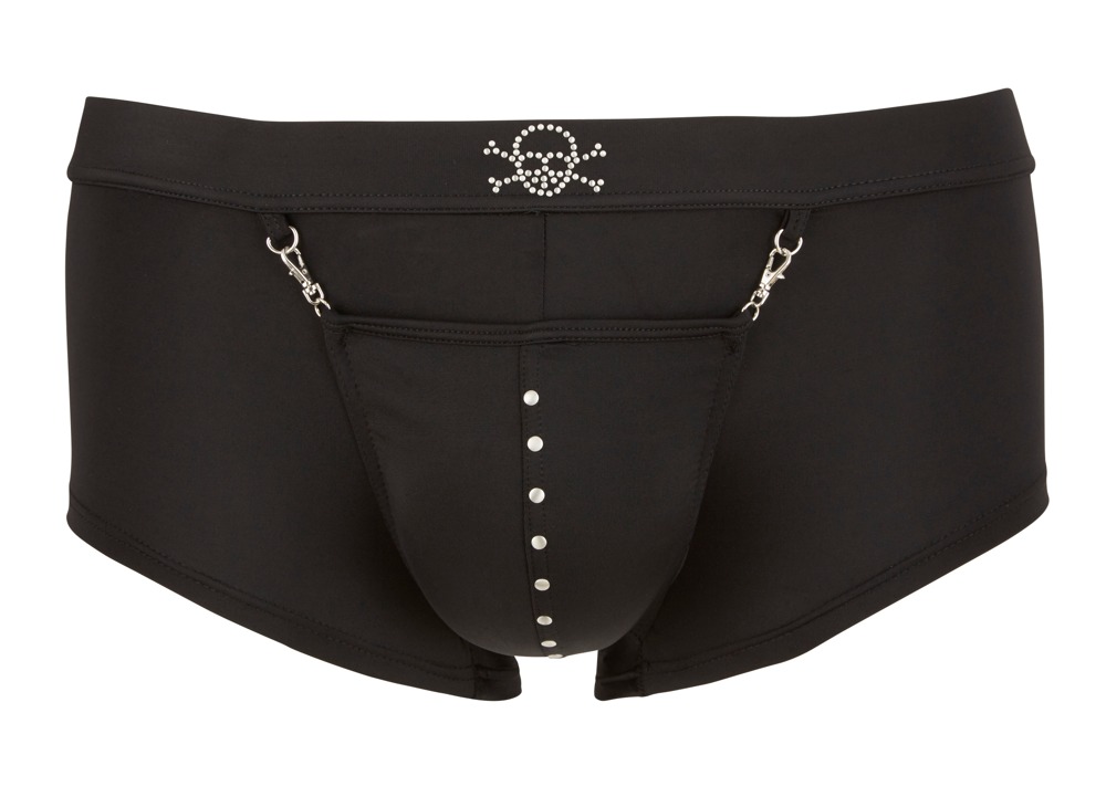 Figure-emphasising pirate pants with a pouch that has snap hooks. With a swell function for an impressive front bulge and an authentic skull on the waistband that is made out of studs. Perfect for wild adventures and hot role play.
