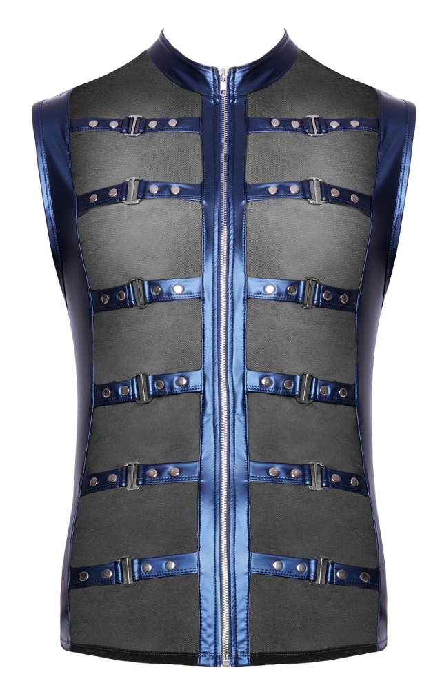 The tight, emphasising shirt from NEK has a small stand-up collar and a full-length front zip. The shirt is made out of cool metallic blue matte look material and there are also straps at the front with stud decoration as well. There are transparent black powernet inserts underneath the straps. It is soft and stretchy for perfect and comfortable fit.