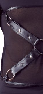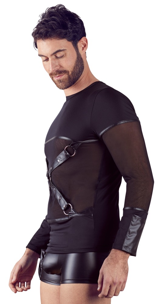 Matte look shirt with long sleeves and a stylish powernet insert at the front to show off a man’s muscles. The removable chest harness (press studs) has beautiful and exclusive details for the onlooker and it is also seductive, inviting and will whet a partner’s appetite.