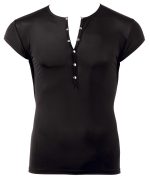 This slightly transparent shirt made out of thin stretchy microfibre will put you in the limelight. With short sleeves and silver-coloured press studs at the front. Black. 85% polyamide, 15% spandex.