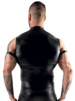Top from Svenjoyment Bondage made out of trendy, black matte look material with a harness (not removable) with studs on it. The harness has a ring at either side for the included arm loops that will restrain the arms. The matte look arm loops can be adjusted because they have hook and loop fasteners.