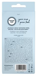 Transparent, extremely thin Mister Size condoms (49 mm) made out of natural rubber latex. The condoms are covered in lubricant and are teat-ended. Vegan.
