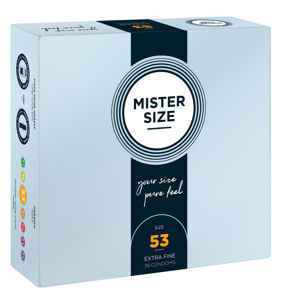 Transparent, extremely thin Mister Size condoms (53 mm) made out of natural rubber latex. The condoms are covered in lubricant and are teat-ended. Vegan.