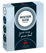 Transparent, extremely thin Mister Size condoms (60 mm) made out of natural rubber latex. The condoms are covered in lubricant and are teat-ended. Vegan.