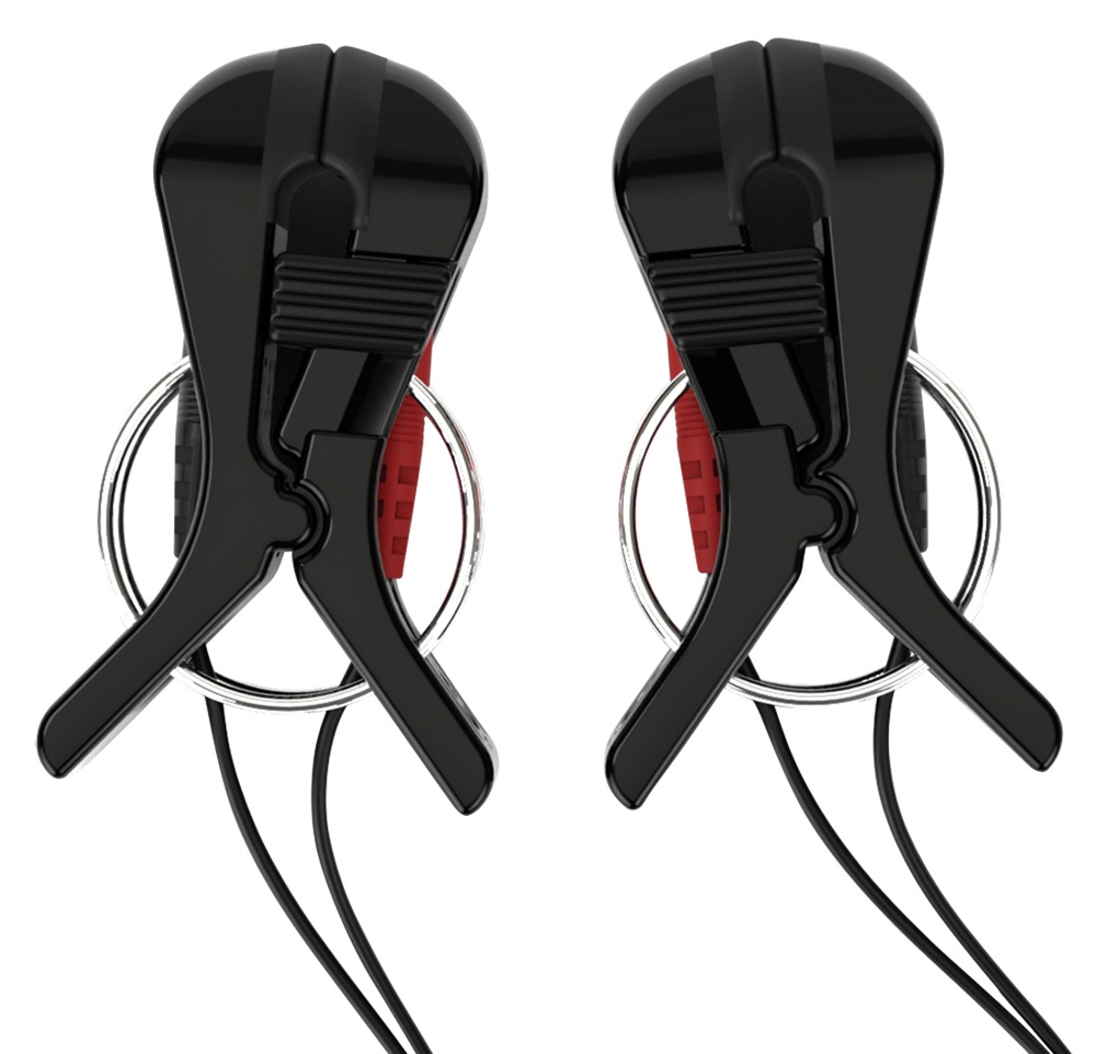 Bi-polar, conductive e-stim clamps New Bites for stimulation device Tension Lover or Pure Vibes by Mystim. For electrifying stimulation pleasure on the nipples, labia and other areas of the body. As each of the clamps is bipolar, only the tissue that lies exactly between the two halves is stimulated, so stimulation of both nipples at the same time is also possible without risk. The gold-plated contacts of the clamps also ensure particularly intense and even stimulation. The gripping intensity of the clamps can be adjusted with small set screws.