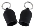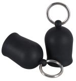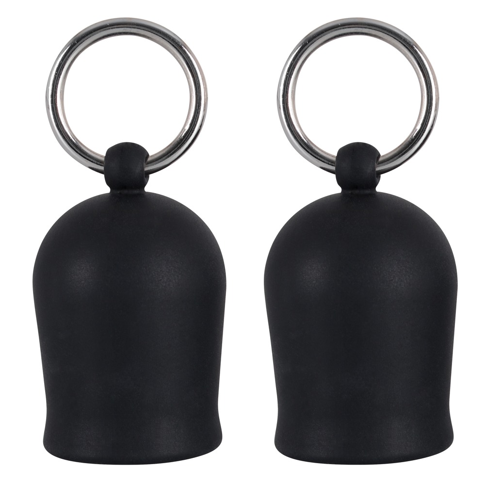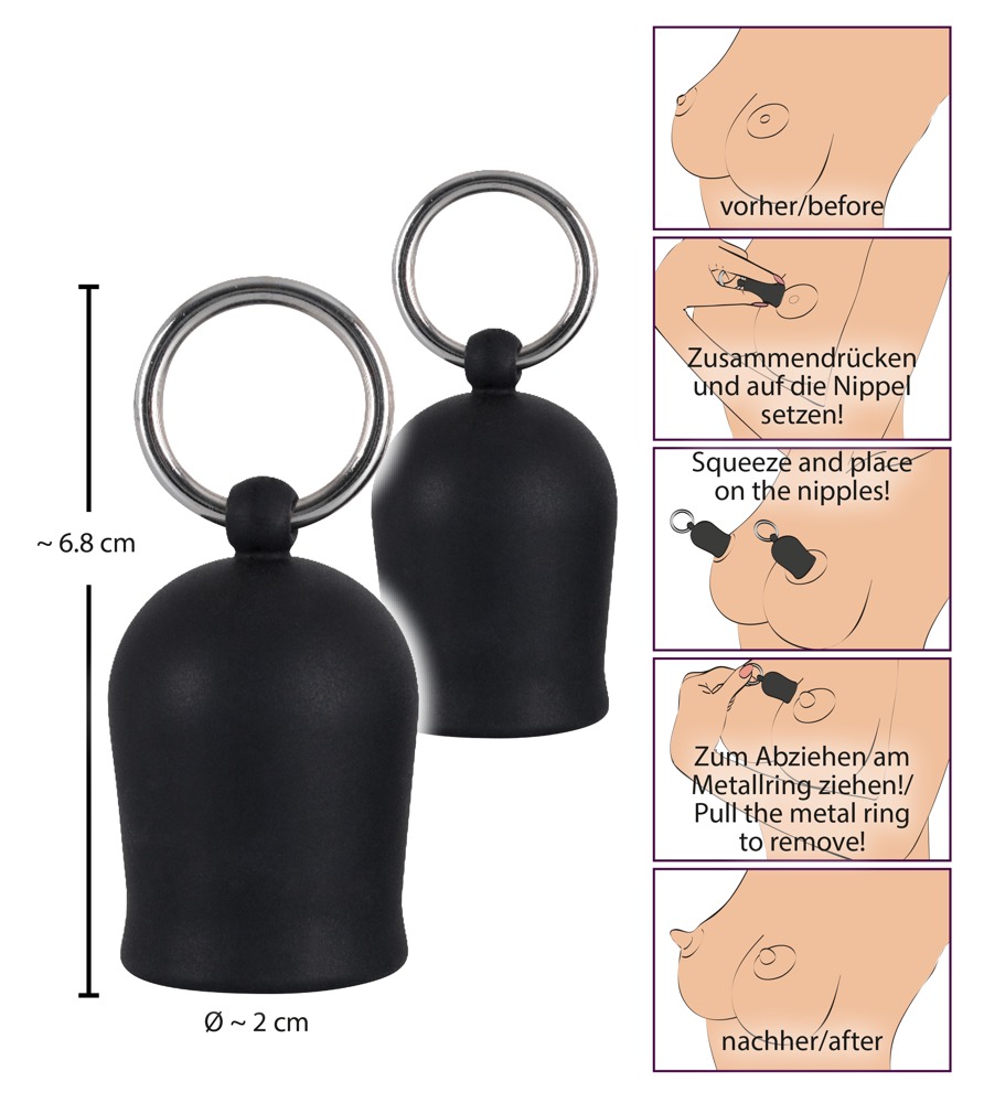 Two black nipple suckers with a metal ring. The suckers are put on the nipples and a sucking vacuum is created when they are squeezed together.