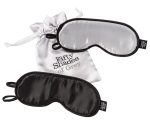 Two luxury opaque blindfolds in a set. The are two No Peeking blindfolds from Fifty Shades of Grey – one is silver and one is black. They are perfect for soft bondage play and as a sleep mask. Outer material is satin, inner material is soft faux fur. Each blindfold is 19 cm long. With elastic head straps. Includes a storage bag.