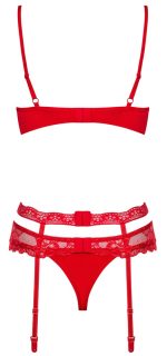 Seductive bra, suspender belt and G-string in a 3-piece set Heartina from Obsessive with beautiful lace and glittery rhinestones. Bra straps and suspender straps are adjustable. Red.
