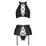 The Nancy Set is a three-piece set from Passion, featuring a halter top, garter belt, and boldly cut thong. All this is made of black leather, which is decorated with numerous crossed stripes that reveal feminine qualities.