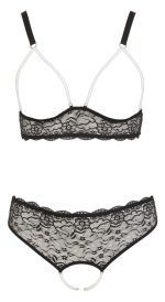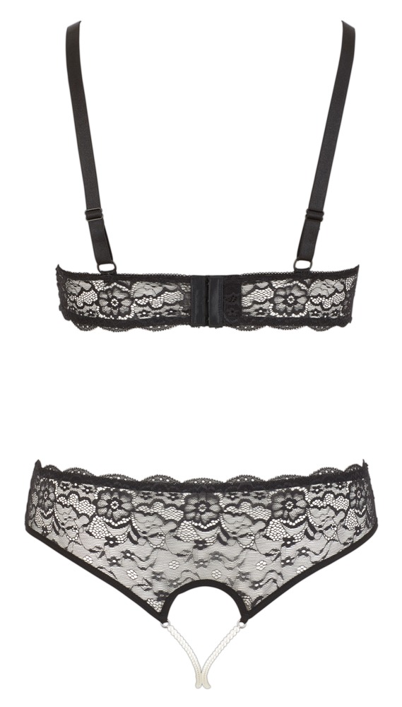 The wireless bra with a hook-fastener at the back, adjustable straps and pearl chains above the breasts definitely stands out from the rest. The G-string also has 2 pearl chains over the completely open crotch area.