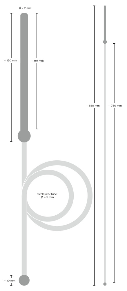 Dilator 12 cm long, insertion length 11 cm, outer Ø 0.7 cm, inner Ø 0.4 cm.