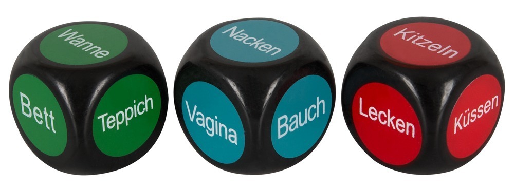 Just throw the three dice: the red one tells you what to do, the blue one decides on the part of the body and the green dice tells you a certain location.