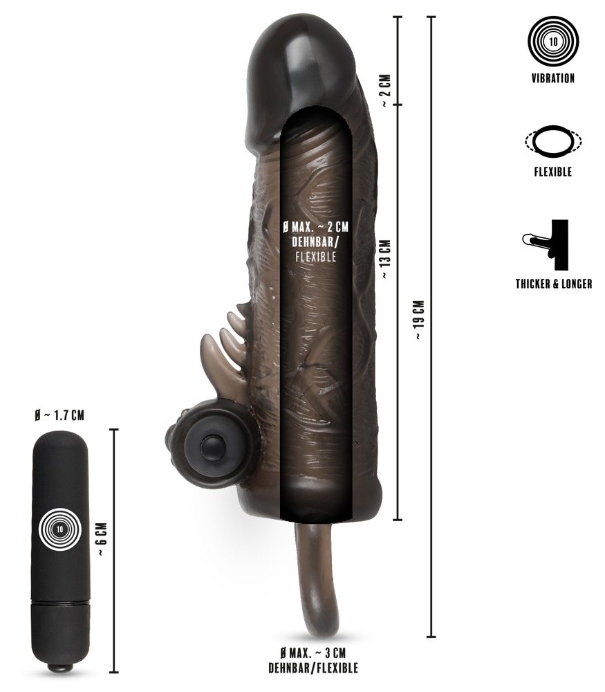 Complete length 19 cm, Ø 4 cm, extension 2 cm, cock ring Ø 3 cm, bullet: 6 cm, Ø 1.7 cm. TPR, ABS with a PU coating. Includes batteries.