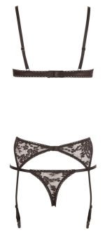 Shelf bra, crotchless string and suspender belt in a set. All three items are made out of stretchy, black lace. Shelf bra with slightly padded, underwired cups. The string is invitingly open in the crotch area.