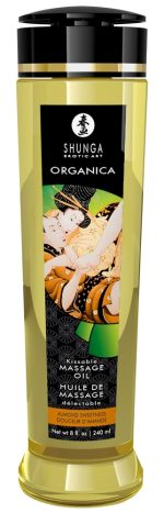 Luxurious Organica Kissable Massage Oil Almond Sweetness from Shunga with a gentle almond flavour that awakens the senses during a partner massage and invites you to kiss and taste. The vegan massage oil is made from 100% cold-pressed natural oils and contains nourishing vitamin E. It glides gently and easily over the skin without leaving an unpleasantly greasy feeling and residue. On the contrary, it leaves the skin silky soft! In addition, it is very rich – it is enough for many sensual and passionate full-body massages.