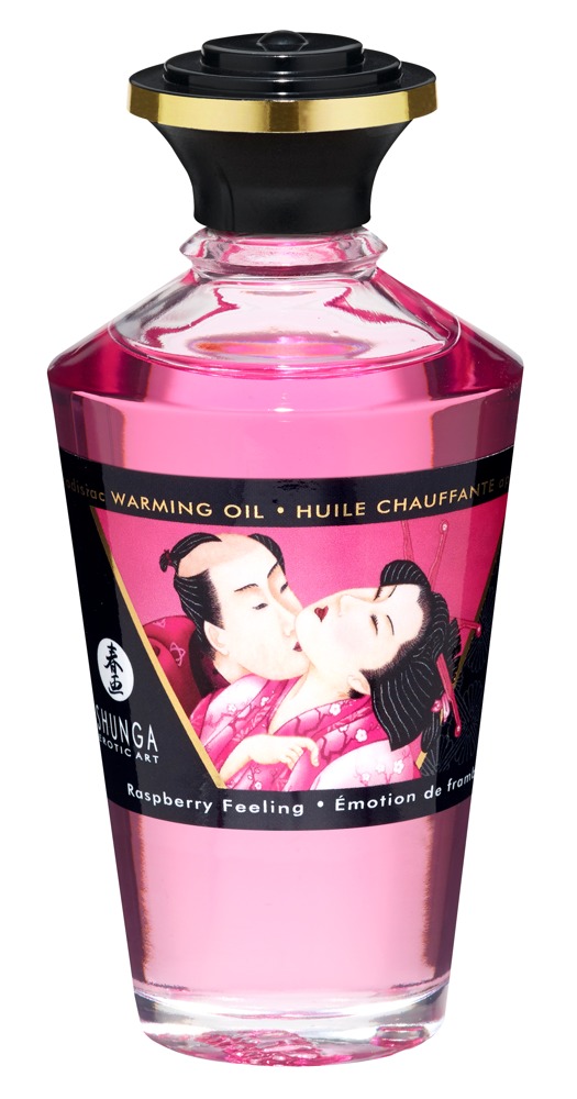 Luxurious Aphrodisiac Warming Oil Raspberry Feeling from Shunga with a delicious raspberry aroma that awakens all the senses during an intimate massage! It also has a tingling warmth effect that is subtly intensified by breathing on it. Natural ingredients nourish the skin and the exquisite food-grade aroma invites you to kiss it. A treat for body and soul – and the perfect gift in the elegant glass flask in a beautiful packaging cylinder.