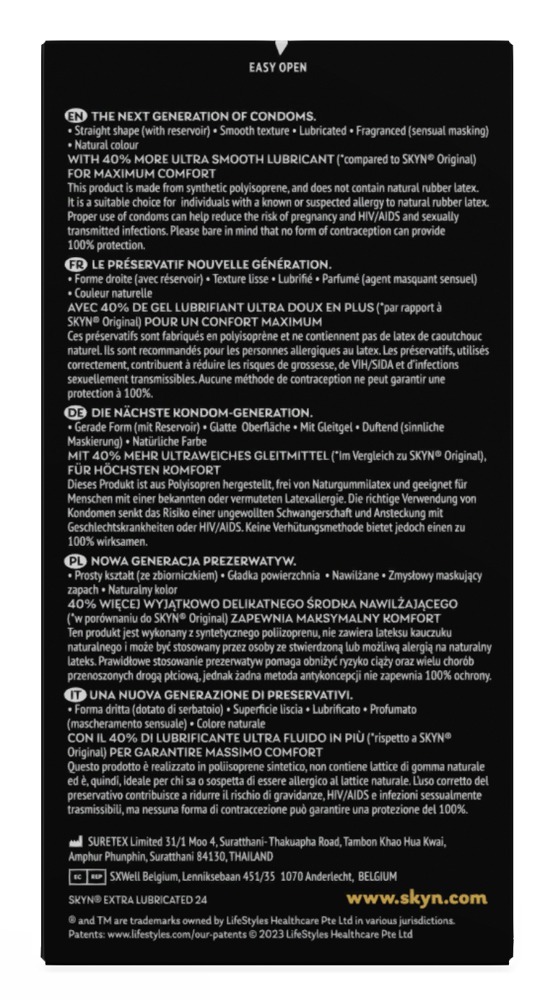 The transparent and extra thin condoms, Extra Lubricated from SKYN, are covered in 40% more silicone-based lubricant for gentle and sensual enjoyment. They are made out of sensoprene (poylisoprene), which means that they are velvety soft and feel very realistic. They are also latex-free and odourless – perfect for people who have a latex allergy or who are sensitive to latex. They are teat-ended. Vegan.