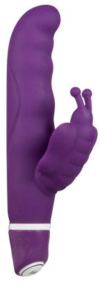 Purple silicone vibrator with two motors. One at the tip of the shaft, the other inside the butterfly clit tickler. 7 vibration modes with easy control botton adjustment. Full size: 15.5 cm. Penetration depth: 8.5 cm (approx.). 2.5 cm diameter (approx.). Material: silicone. (Please order batteries separately: 2 x AAA/micro)