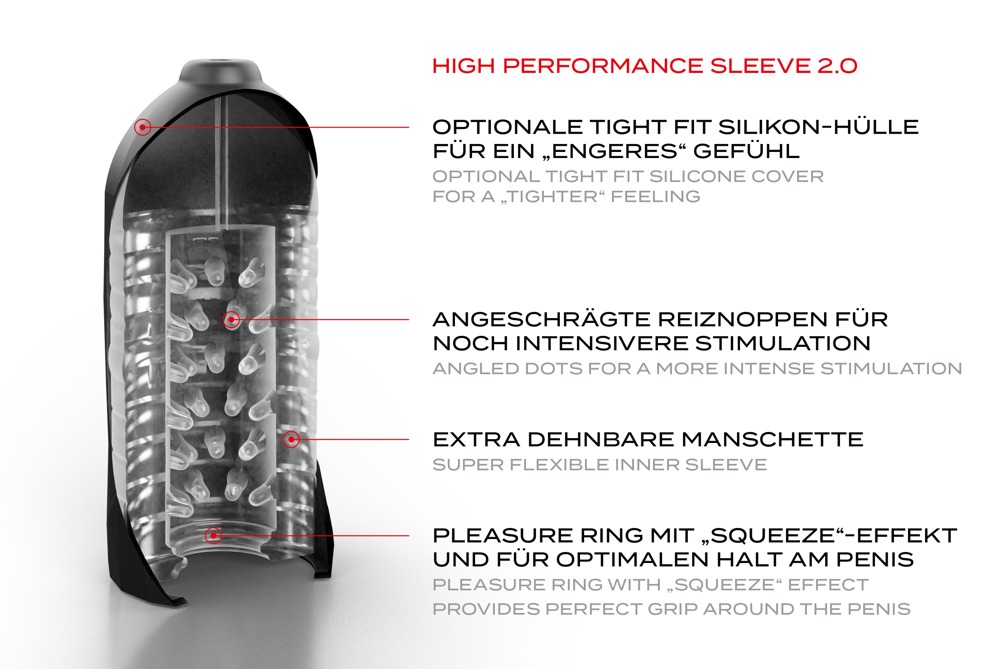 It now has stimulating nubs on the inside and can be combined with the included Tight Fit cover to increase the grip around the penis and to let the stimulation reach new heights.