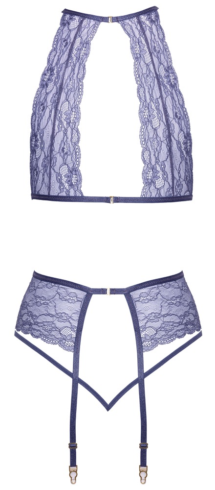 The wireless bra, suspender belt & string in a set from kissable is made entirely out of delicate lace. It is soft and stretchy which means that it is extremely comfortable to wear. The stylish bra has a hook fastener at the back of the neck and at the back. The suspender belt has a hook fastener at the back and adjustable suspender straps. The small string is extremely seductive because of its two narrow stretchy straps that meet in the crotch area.