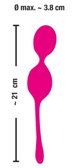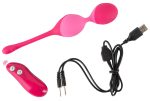 Rechargeable vibrating love ball duo with a stretchy retraction strap and 7 vibration modes. The remote control enables an easy and comfortable handling of the various vibration modes. The vibrating balls and remote control can be recharged at the same time with the two included USB cables.