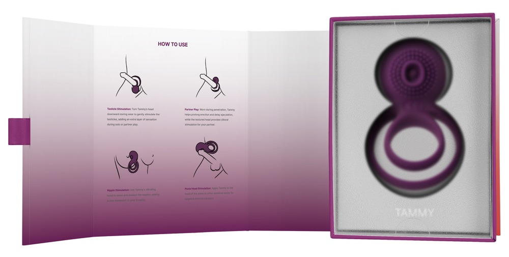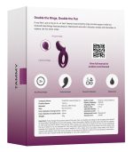 Velvety-soft vibrating cock ring with dotted clitoris attachment and an additional testicle ring. Stimulates with 5 whisper quiet vibration modes in 5 different intensities. Conveniently adjustable at the push of a button. Including a practical storage bag and a USB cable for recharging.