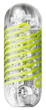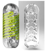 Transparent, reusable masturbator Spinner from TENGA with an integrated coil that causes the masturbator to twist during penetration (Internal Coil Mechanism). The sleeve features fanned tiles with