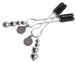Taken from the official Fifty Shades of Grey Collection: Nipple clamps, each equipped with 9-gram weights. The pressure of the clamps can be adjusted. Material: metal.