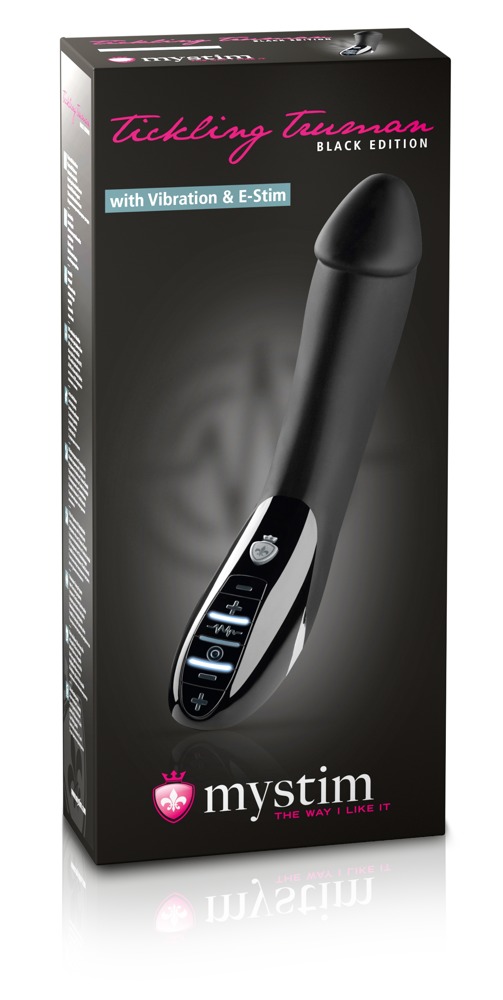 Rechargeable vibrator that stimulates with vibrations and e-stimulation currents (without stimulation current device). An overview of its functions: 8 vibration programmes in 5 intensity levels, 5 E-Stim programmes in 10 intensity levels and 1 pelvic floor training programme. Tickling Truman has 2 extra powerful + quiet vibration motors. 27 cm long, Ø 3.5-4.3 cm. Includes Mystim Magnet Charge USB cable. Material: platinum silicone.