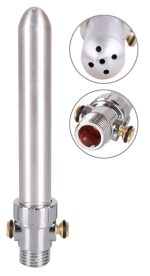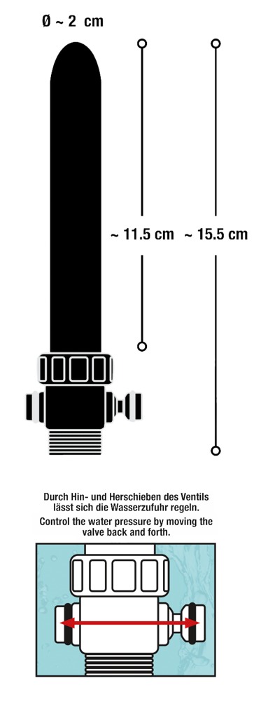 Silver-coloured anal douche with 5 spray holes on the top and a standard screw thread for shower hoses. The special valve reduces the water flow and pressure.