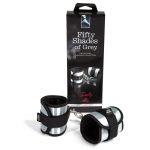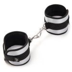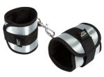 Black and silver-coloured handcuffs that can be joined together by a carabiner. The handcuff’s size is adjustable thanks to velcro fasteners. Material: metal, satin on the outside, soft faux fur on the inside. Silver-coloured storage bag included.