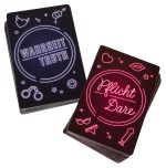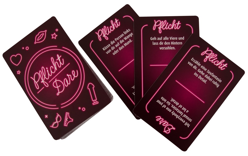 150 cards (75 truth and 75 dare cards). Language: German/English.