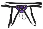Imitation leather strap-on harness including three rings that have different diameters: 4, 4.5 and 5 cm. Purple/black. Maximum circumference: hips 134 cm, leg 82 cm.