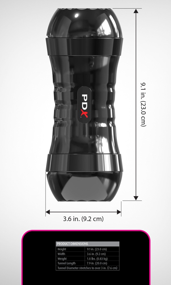 Total length 26 cm, width 10.2 cm, insertion depth 23.6 cm. Inner Ø flexible up to 7.6 cm. Weight 870 g. TPR, ABS.